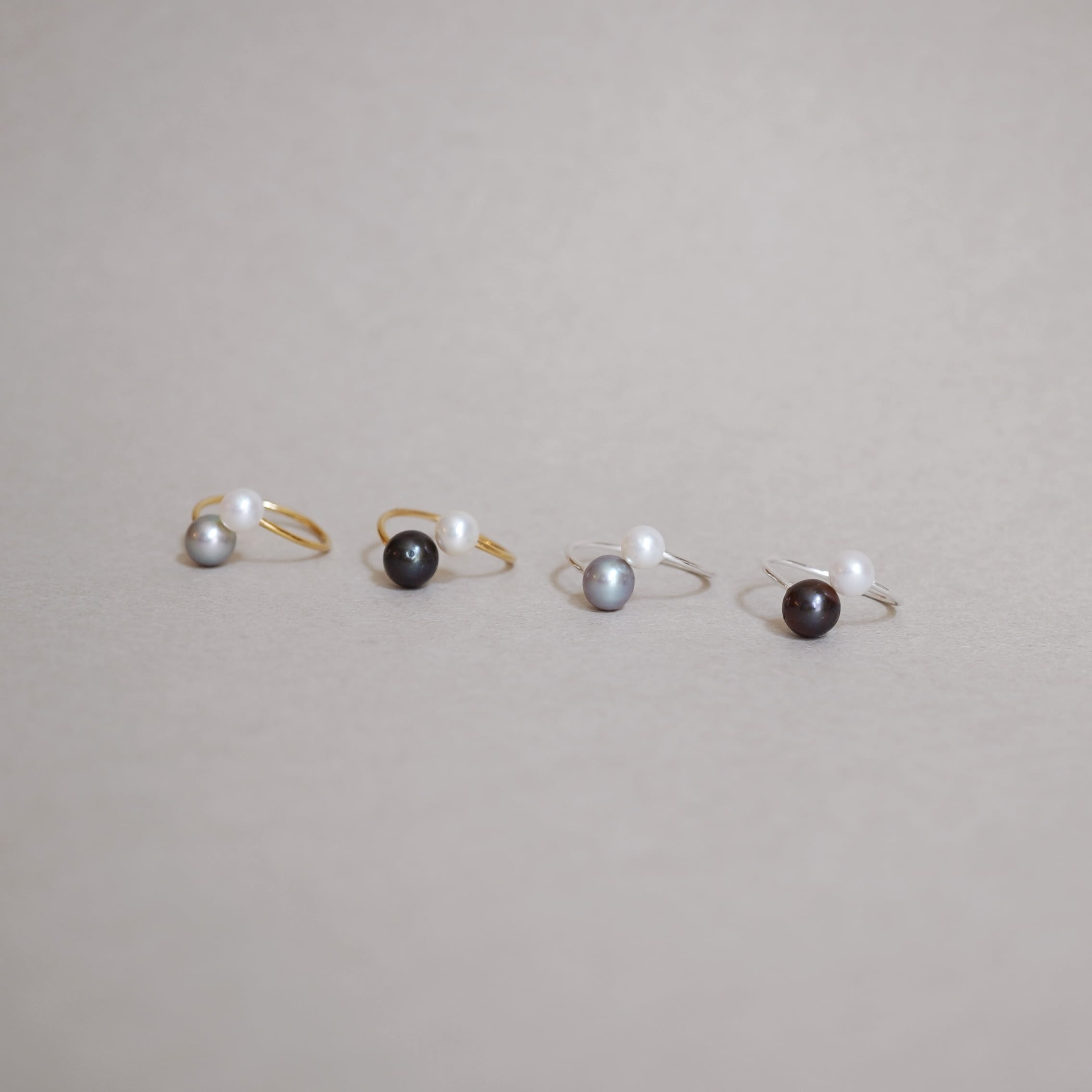 異なる色合いの淡水パールを並べた遊び心あるバイカラーリング。