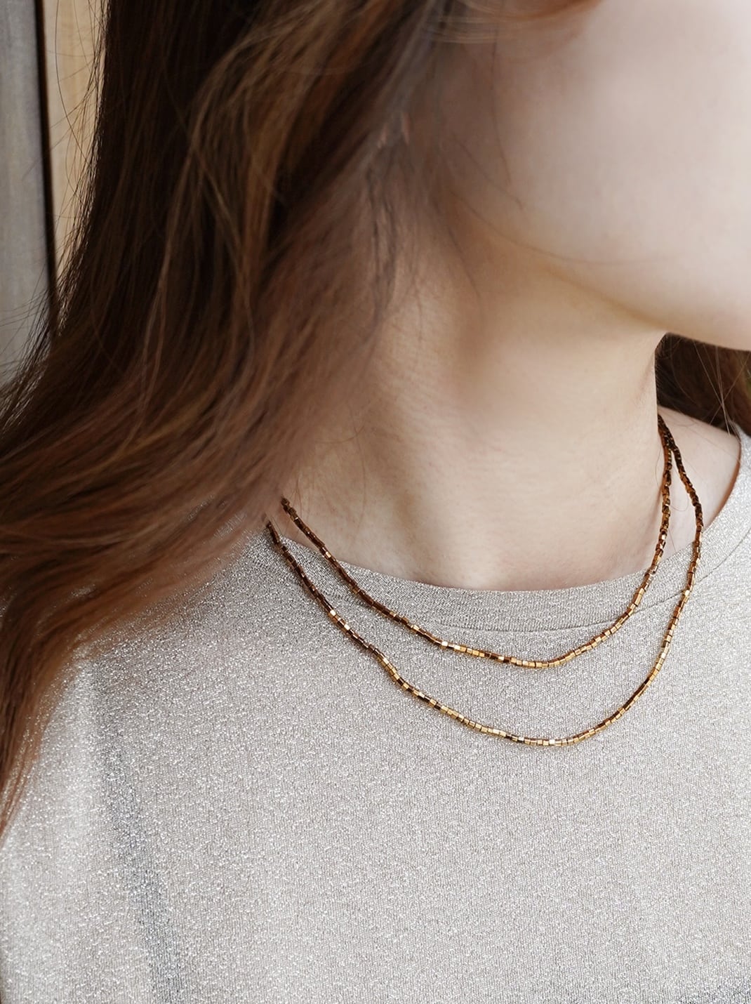 上品にきらめく角ビーズを連ねたロングネックレス。
