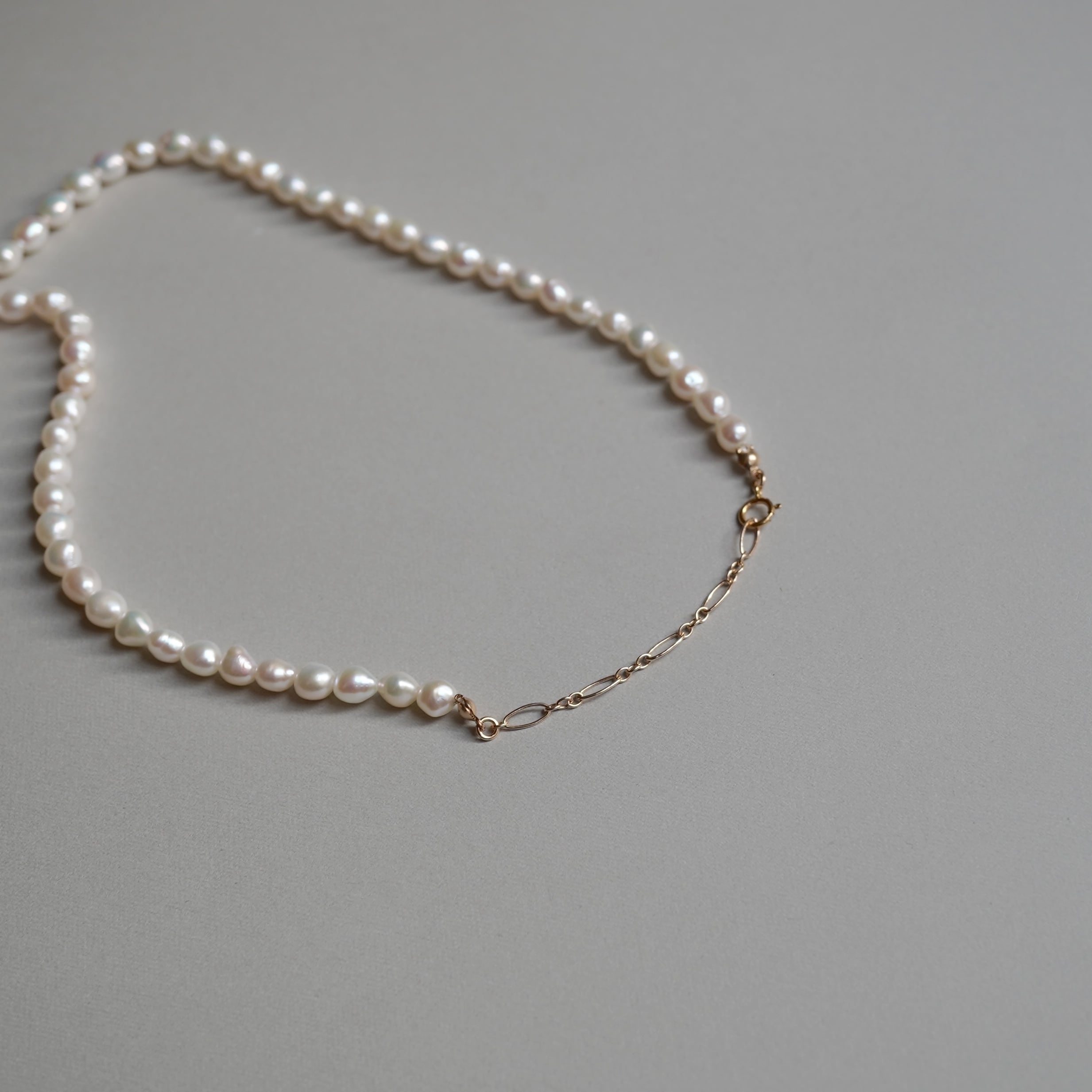 絶妙に個々のフォルムが違うパールは、上品ながらかしこまり過ぎず、首元を美しく引き立て、コーディネートのアクセントにもぴったりです。