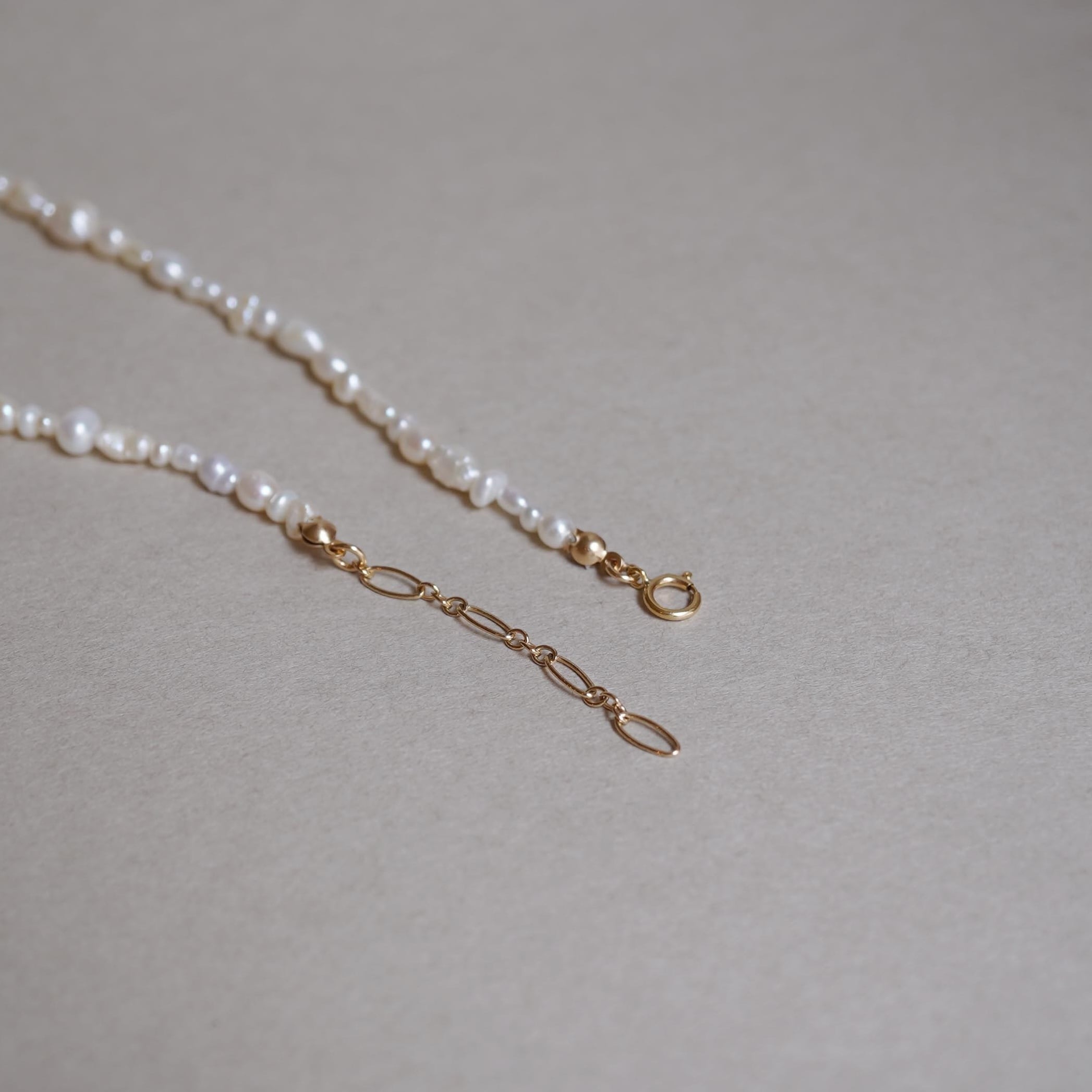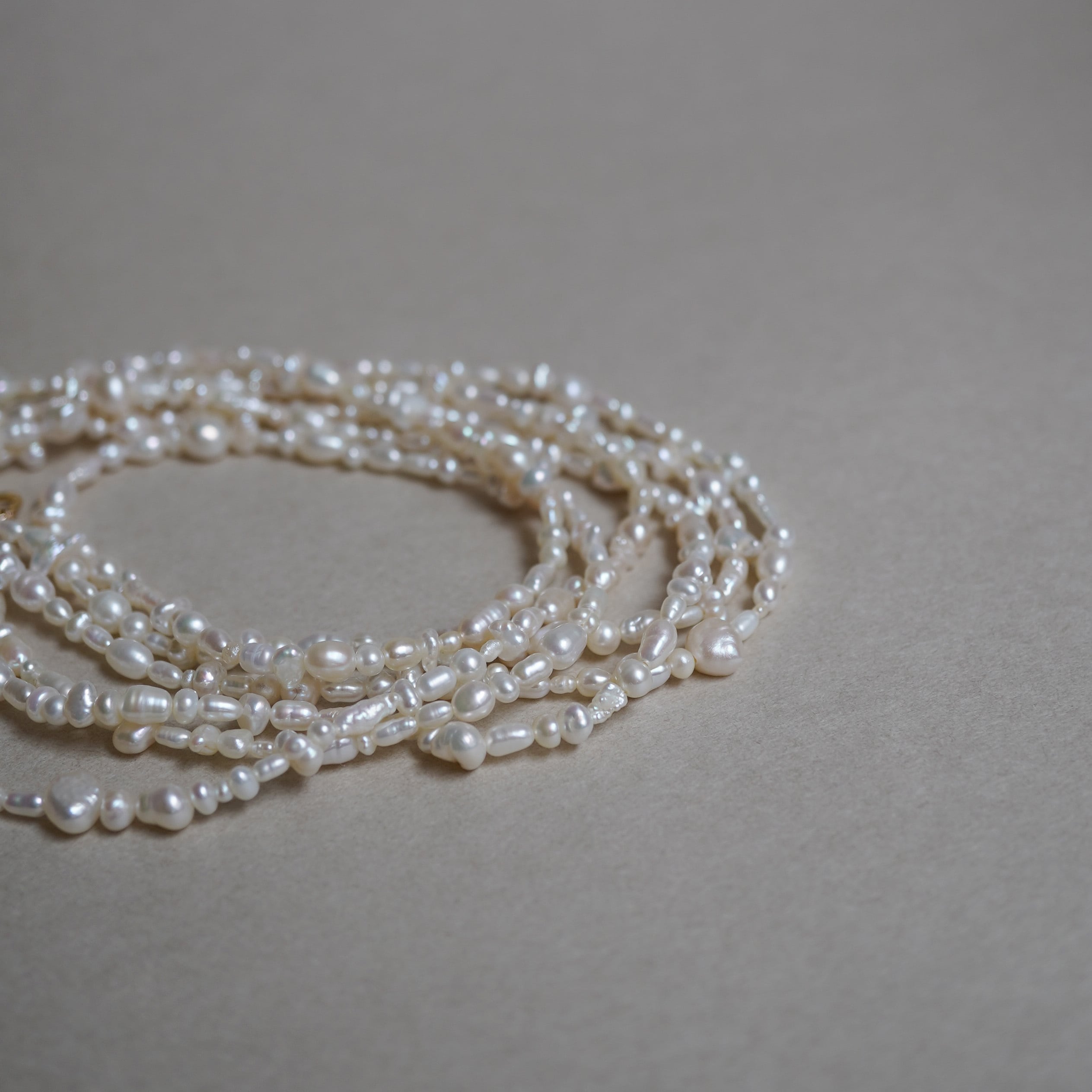 様々なフォルムの淡水パールを連ねたショートネックレス。
