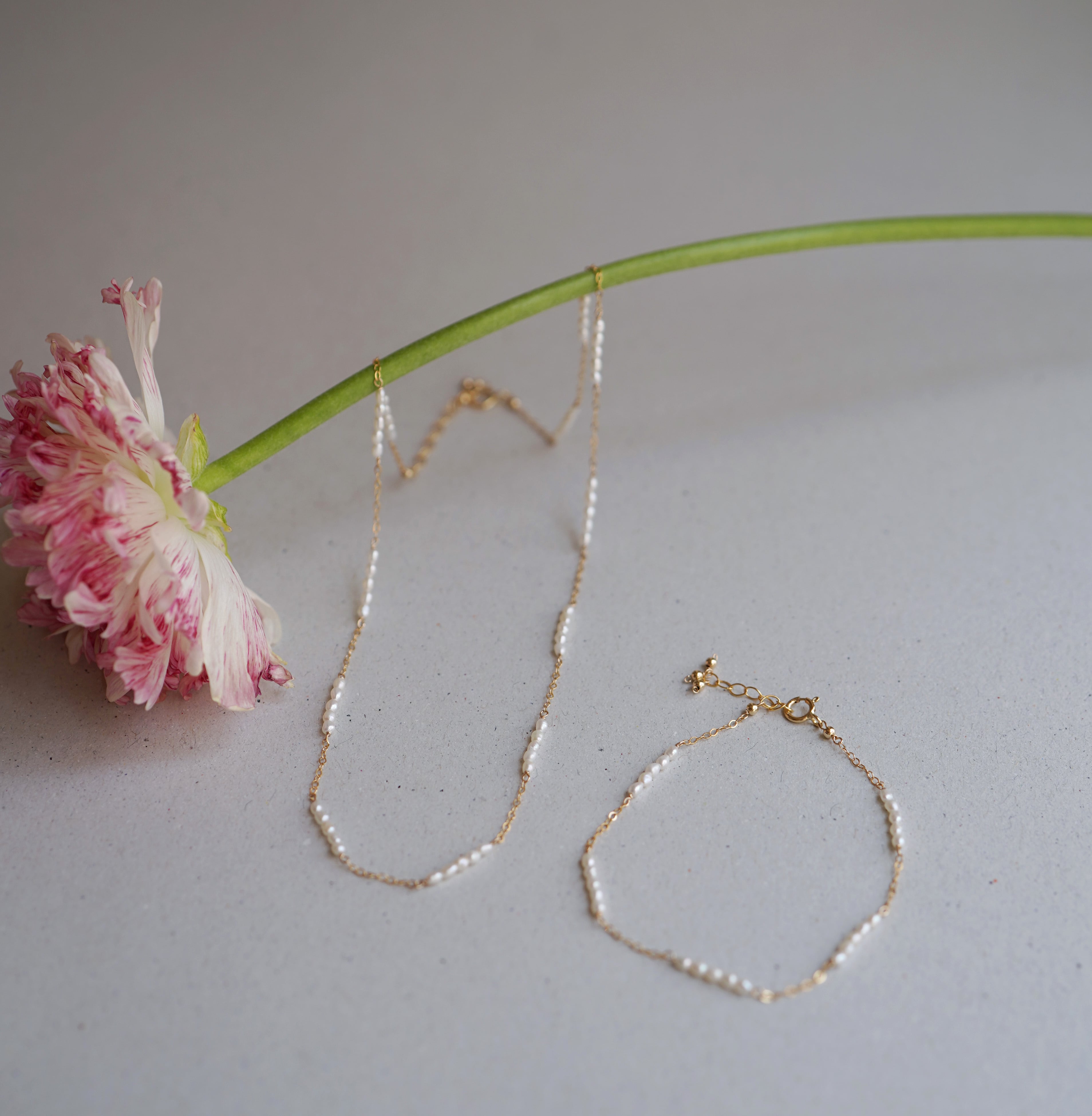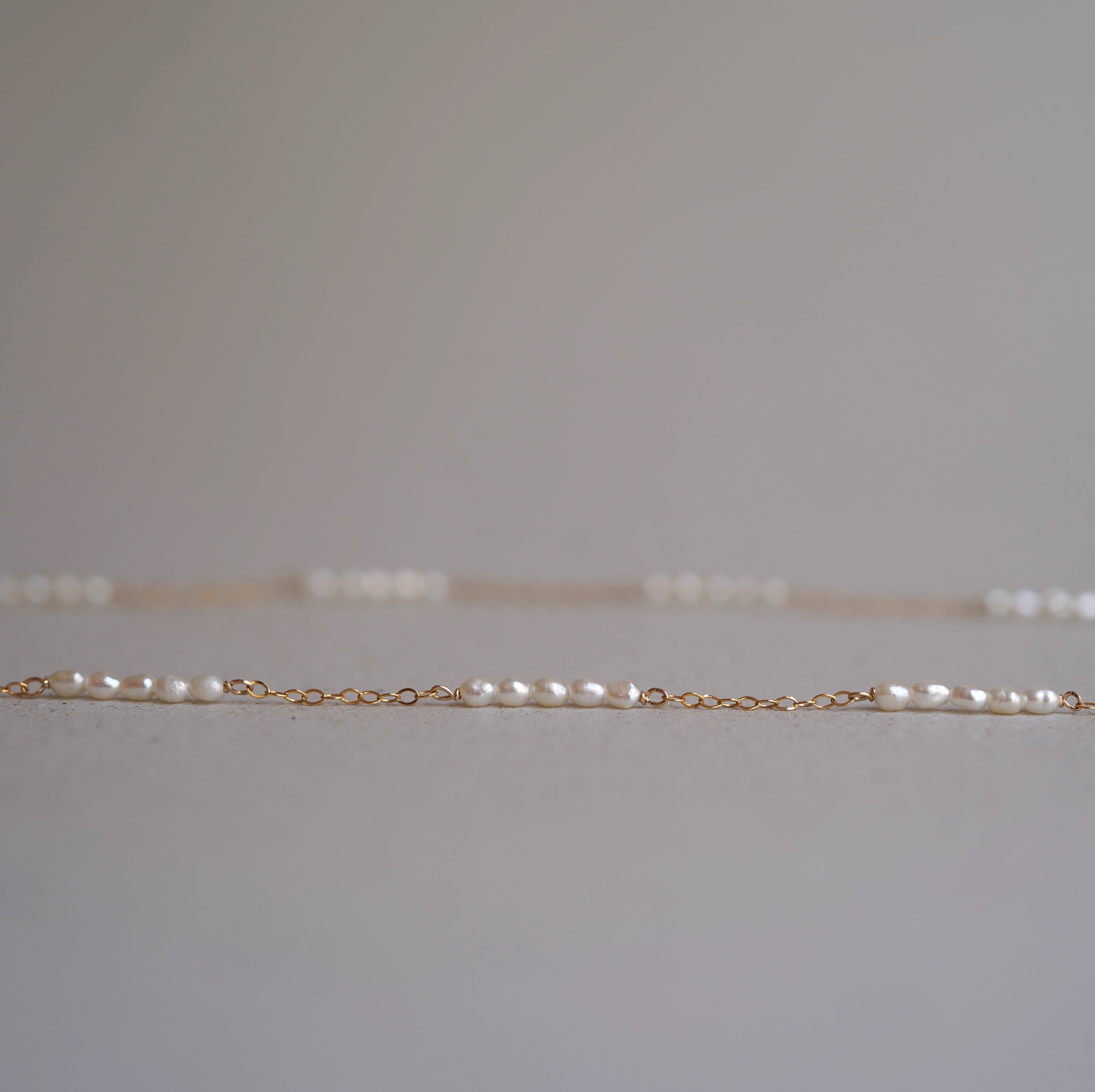 極小のライスパールをライン状にチェーンと繋いだ繊細で軽やかなショートネックレス。