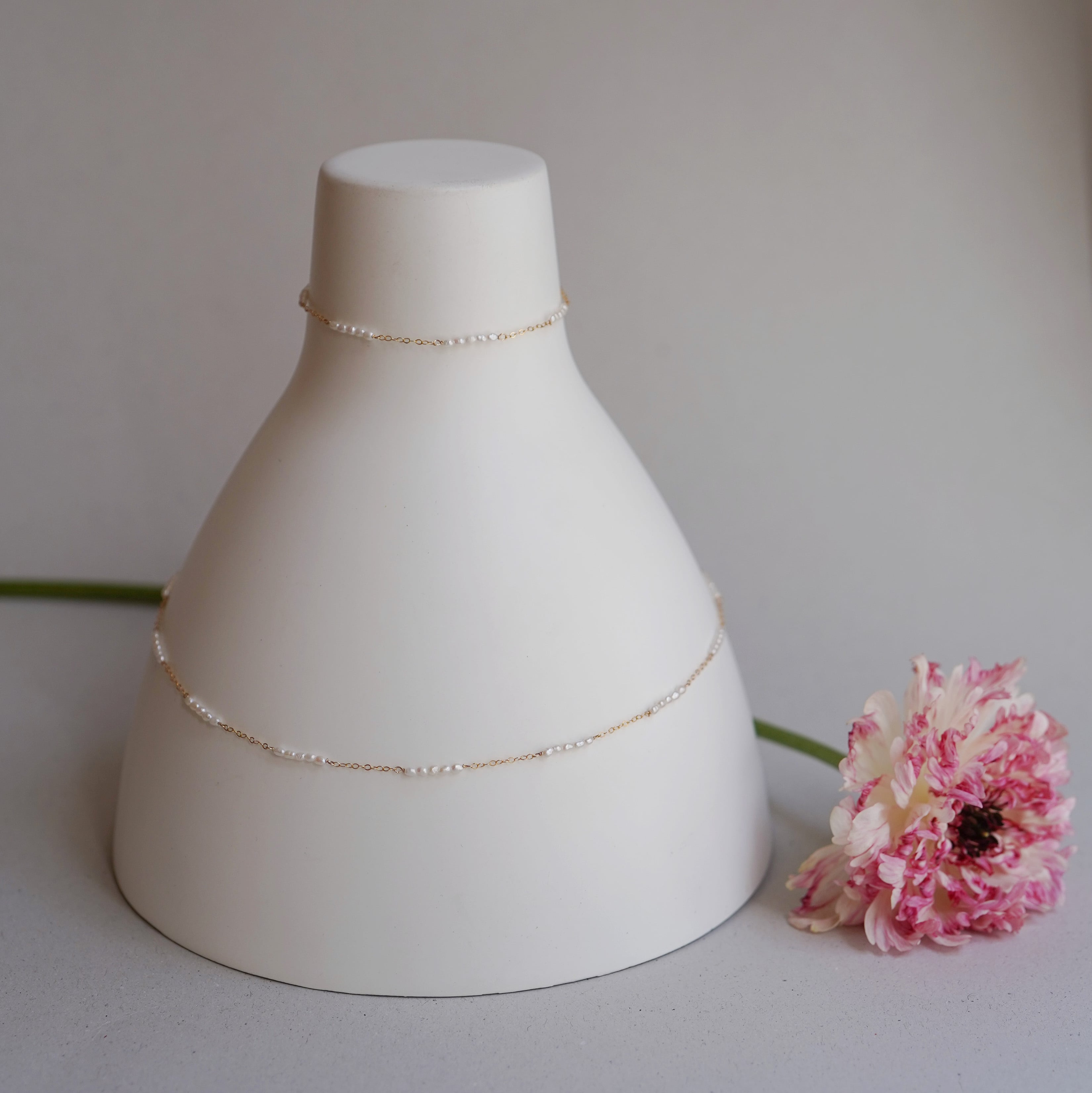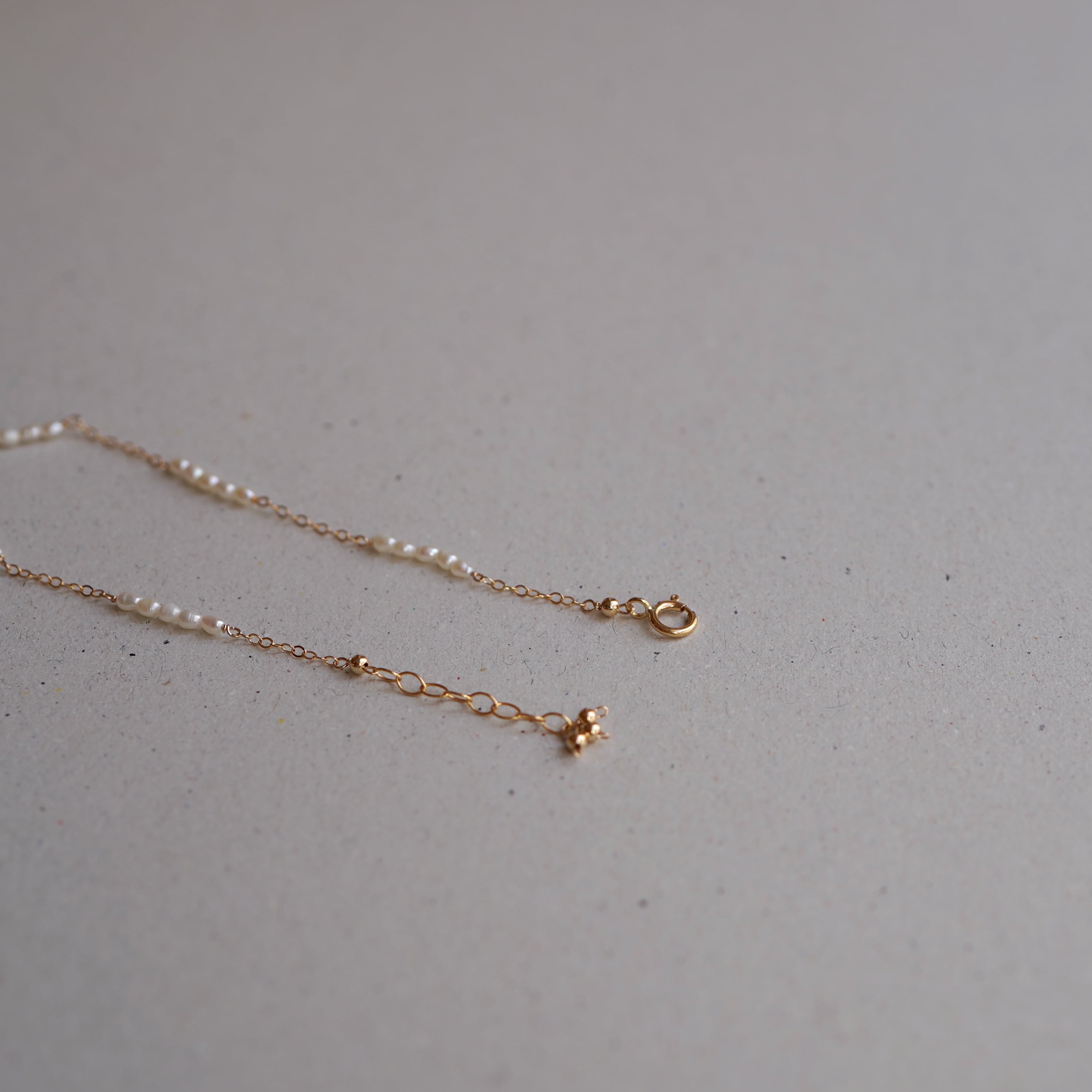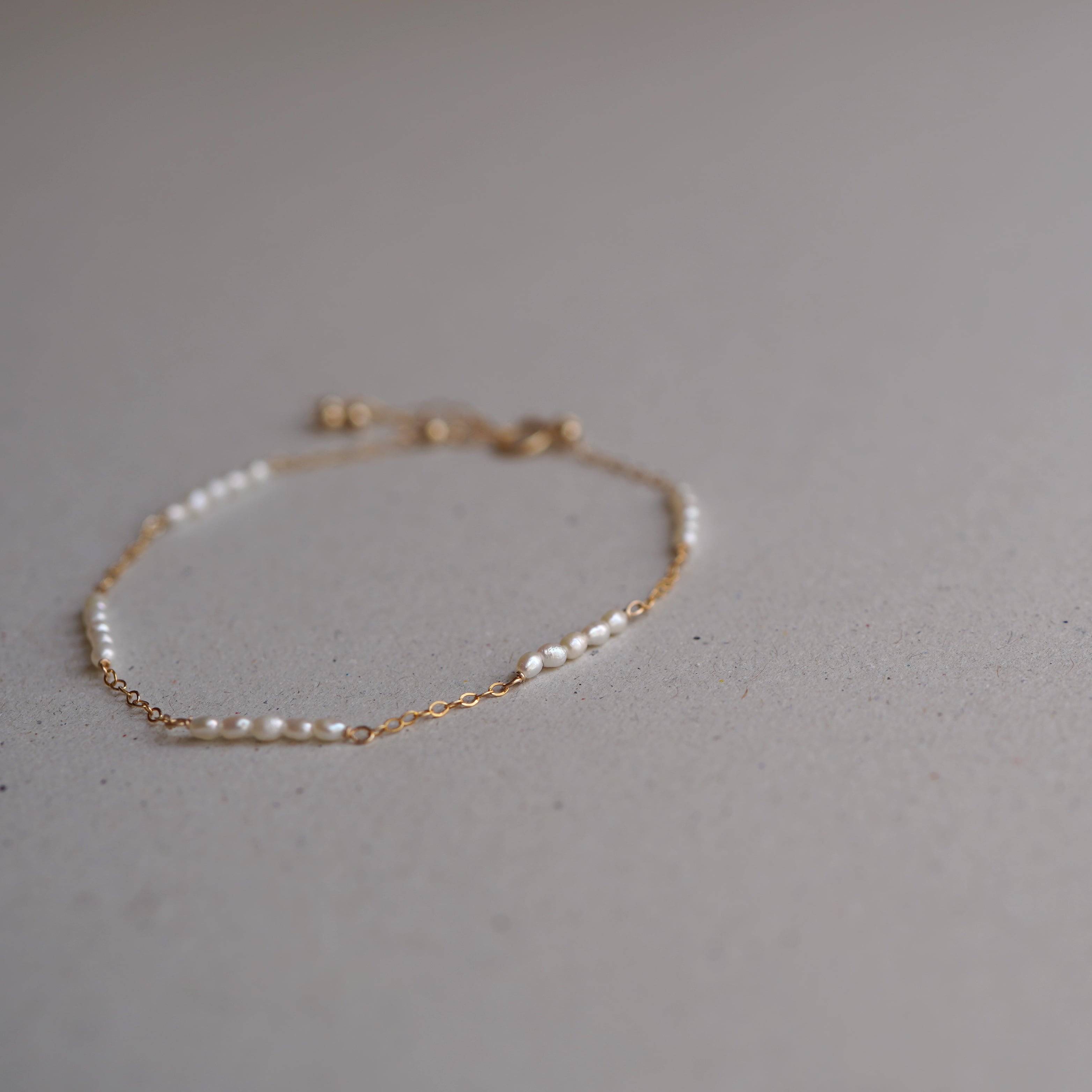 極小のライスパールをライン状にチェーンと繋いだ繊細で軽やかなブレスレット。