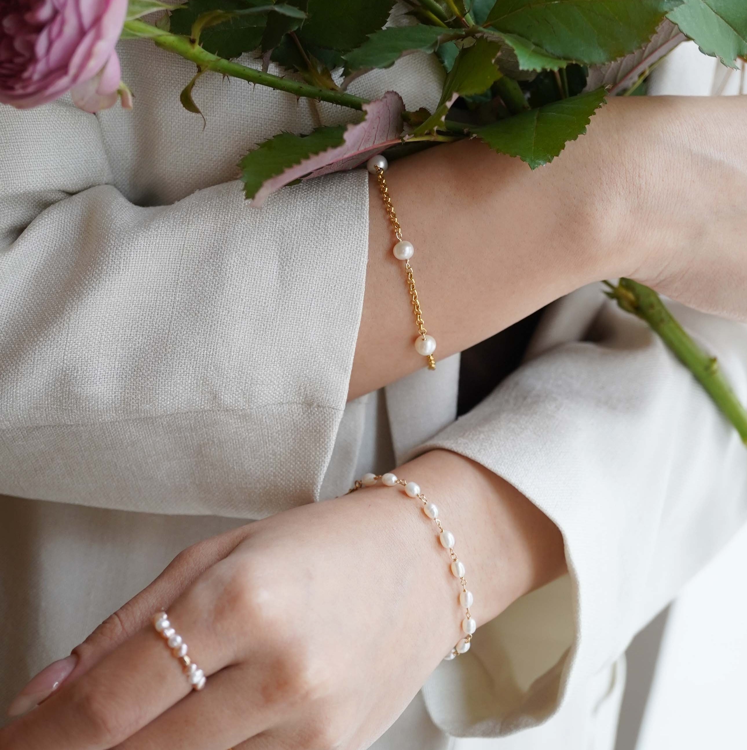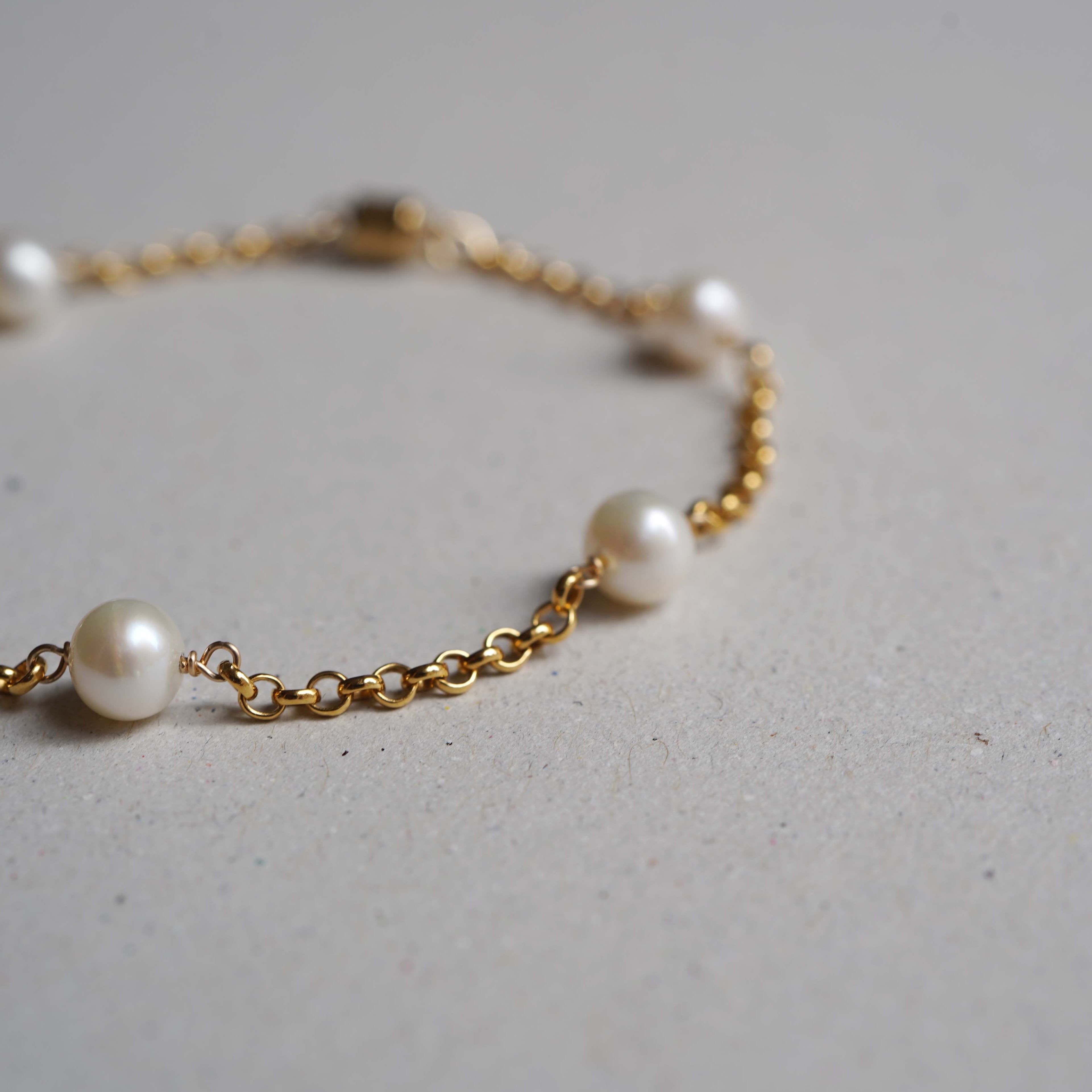 セミラウンドの淡水パールとロロチェーンを組み合わせたブレスレット。
