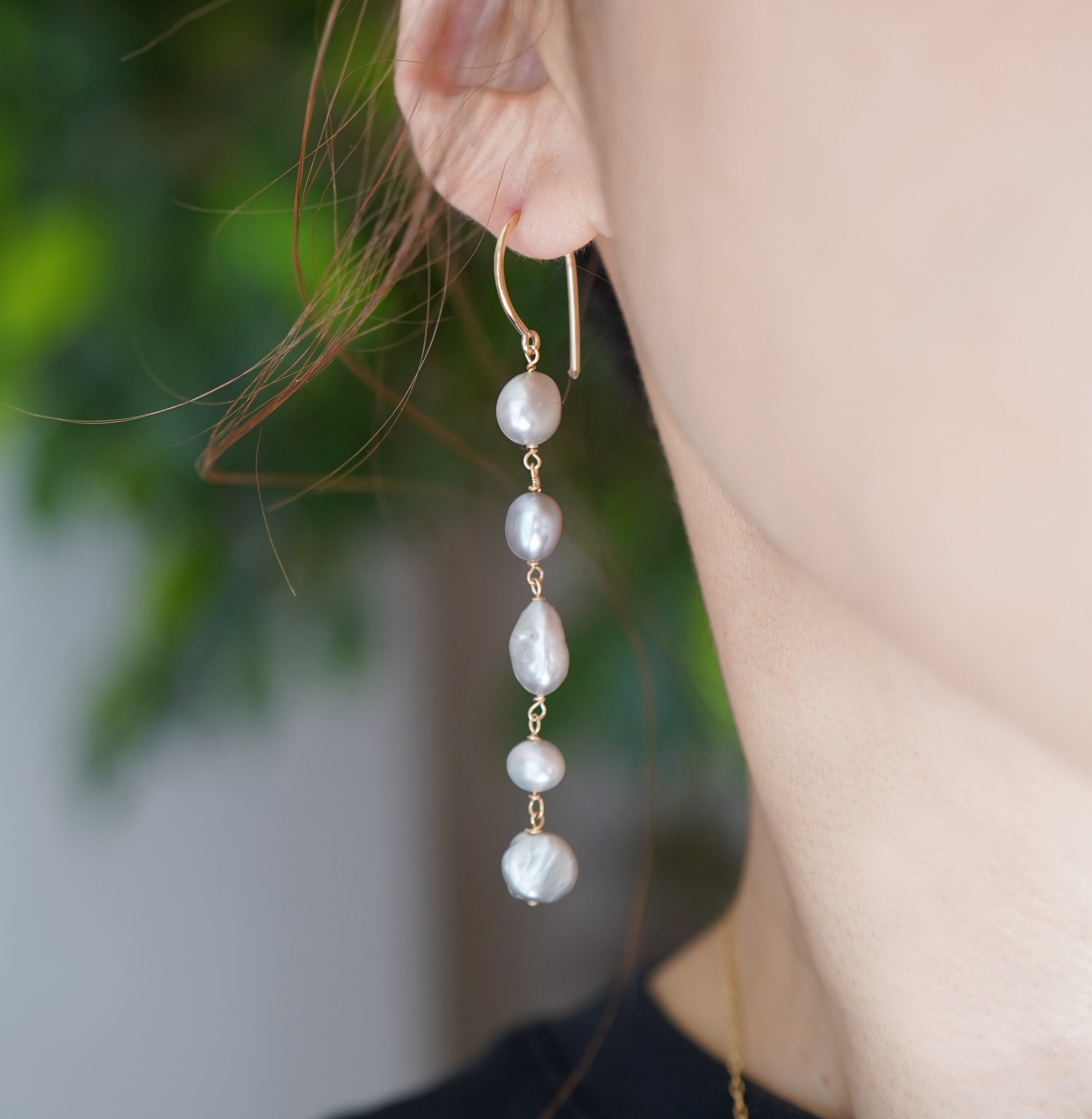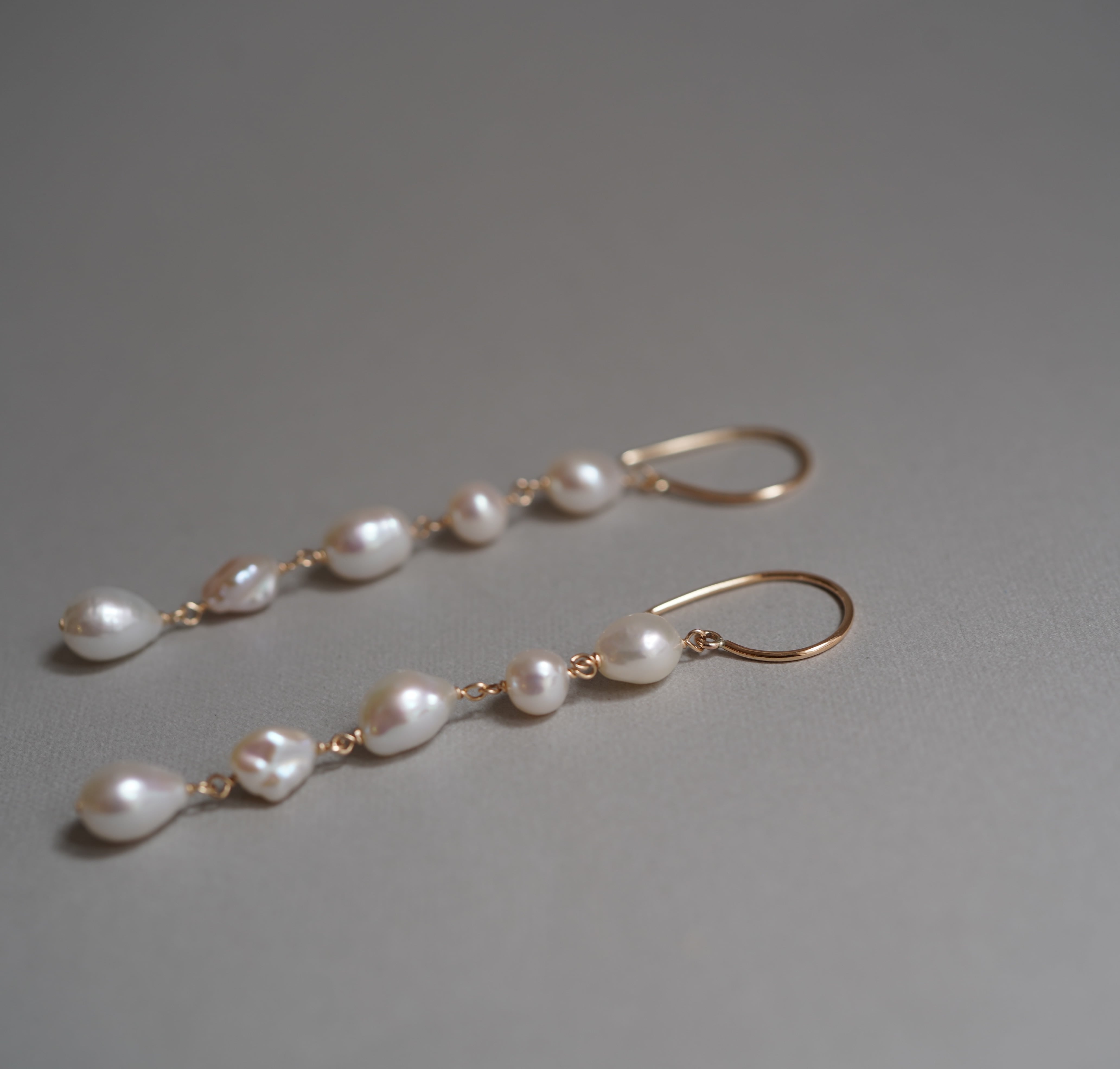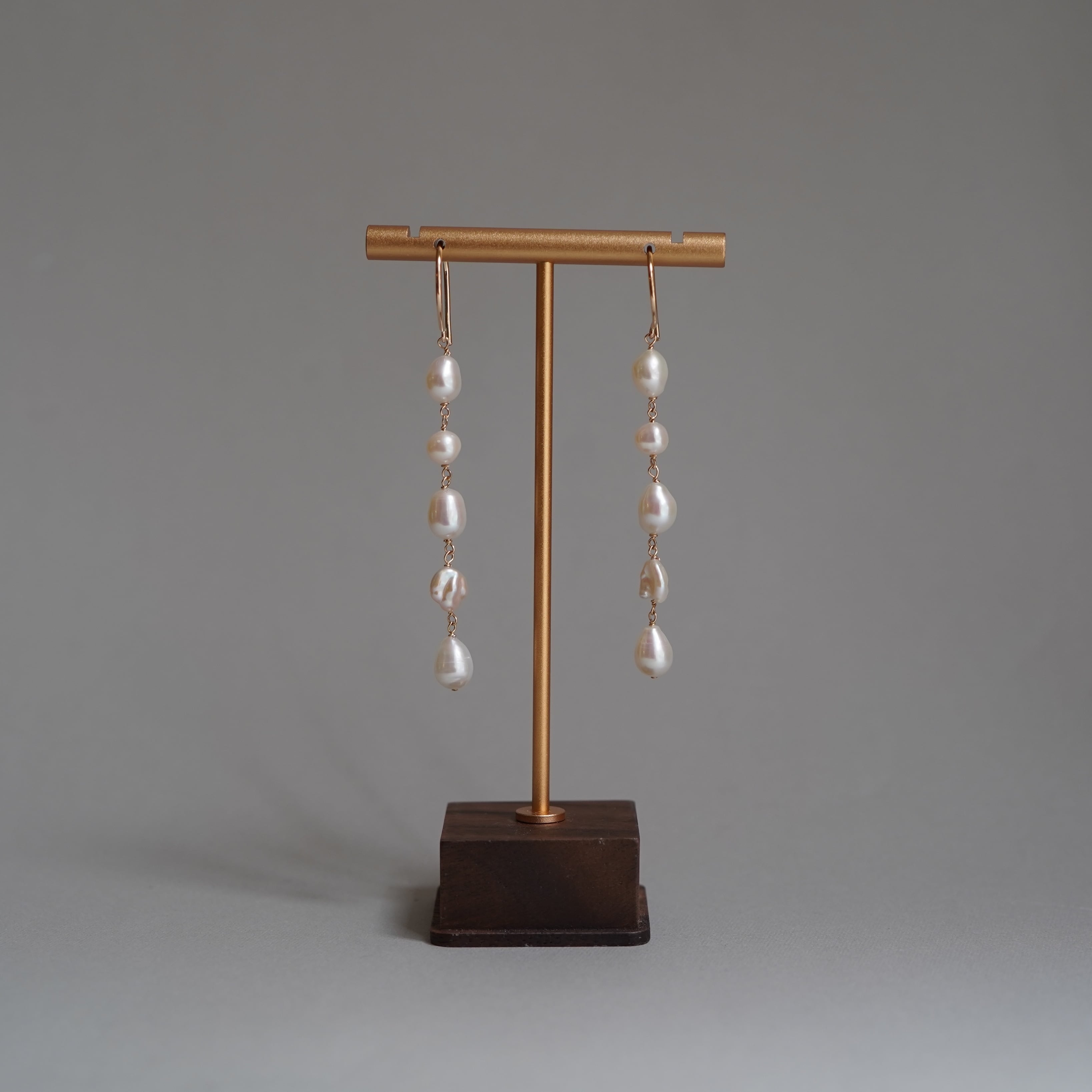 様々な個性を持つ不揃いのバロック淡水パールを繋げたロングピアスです。