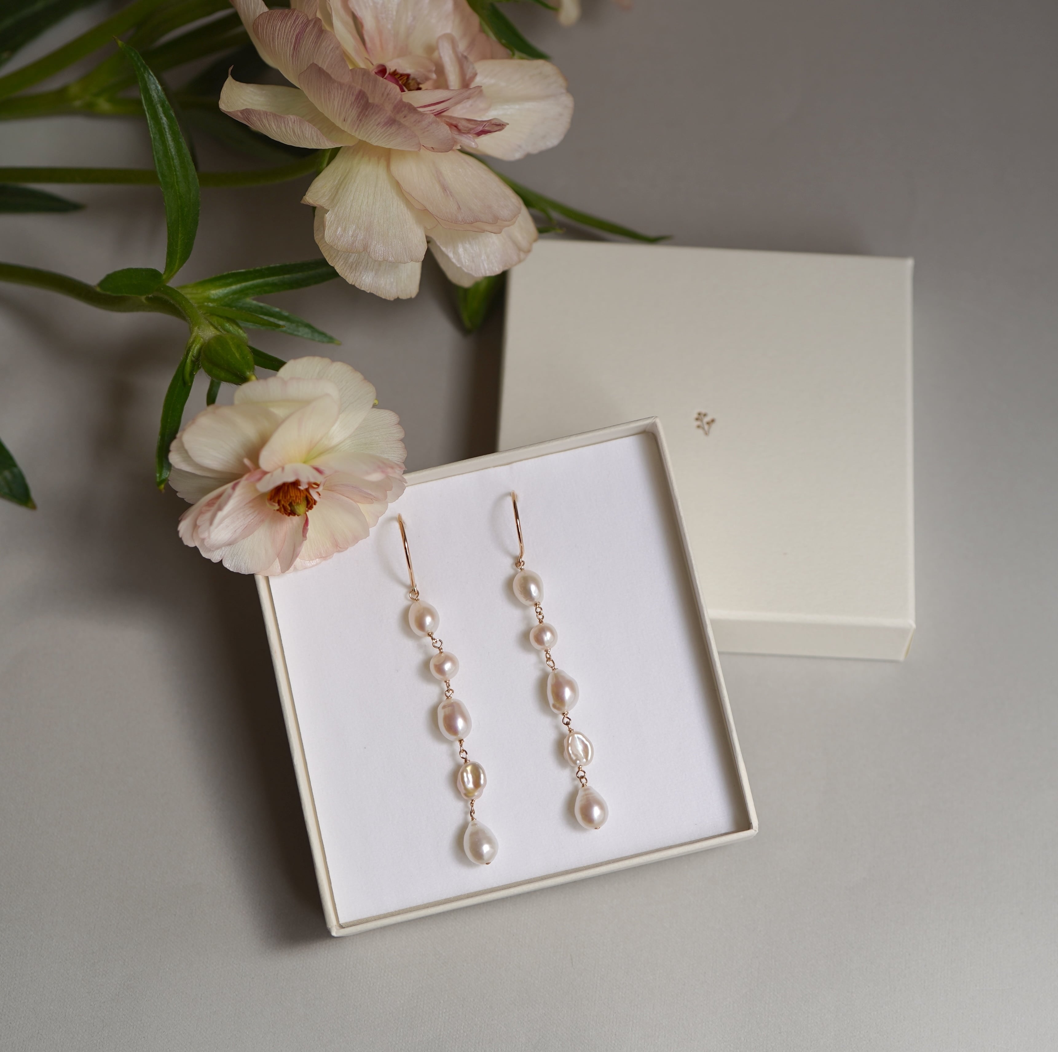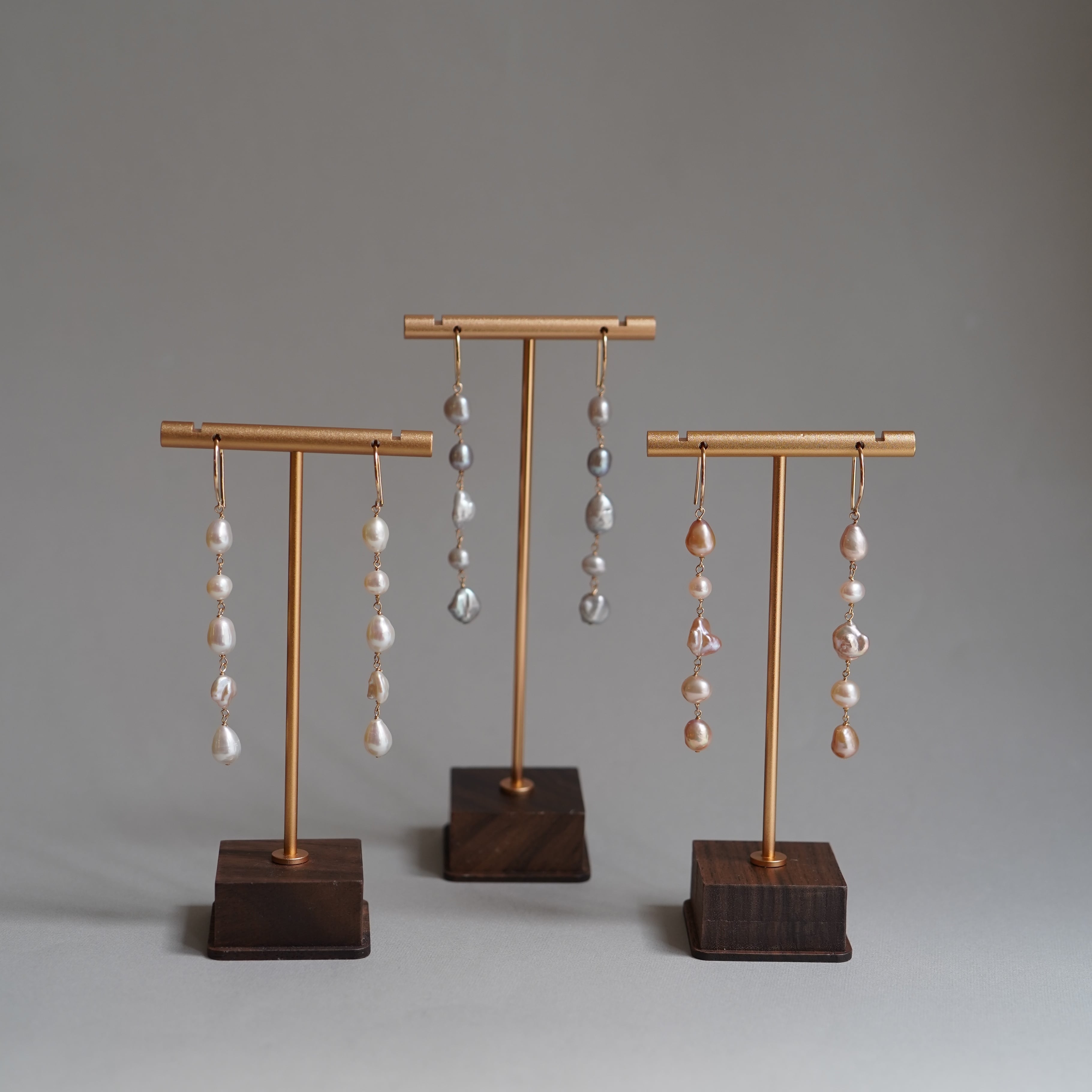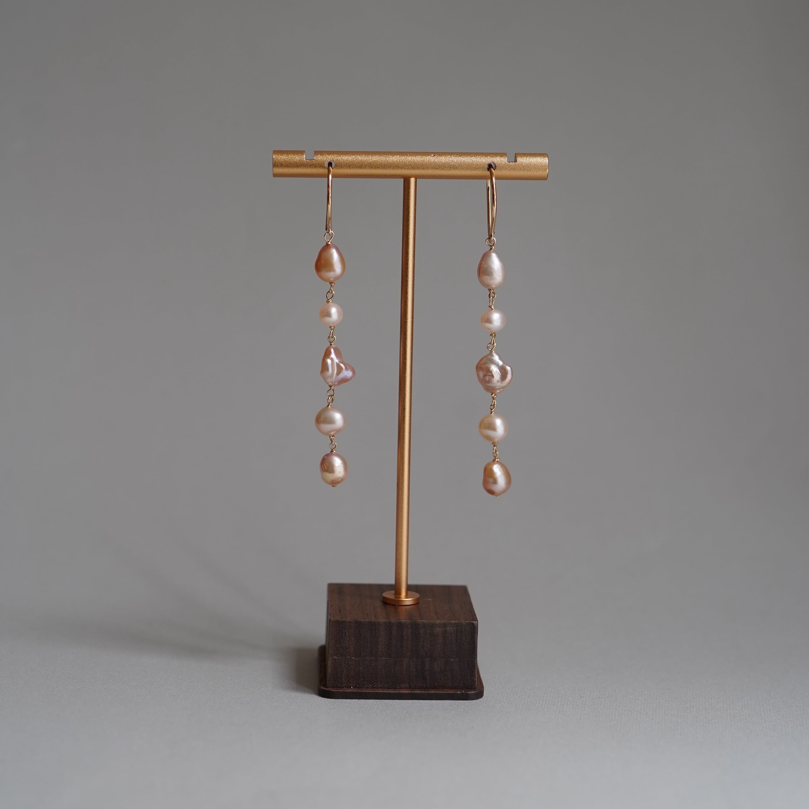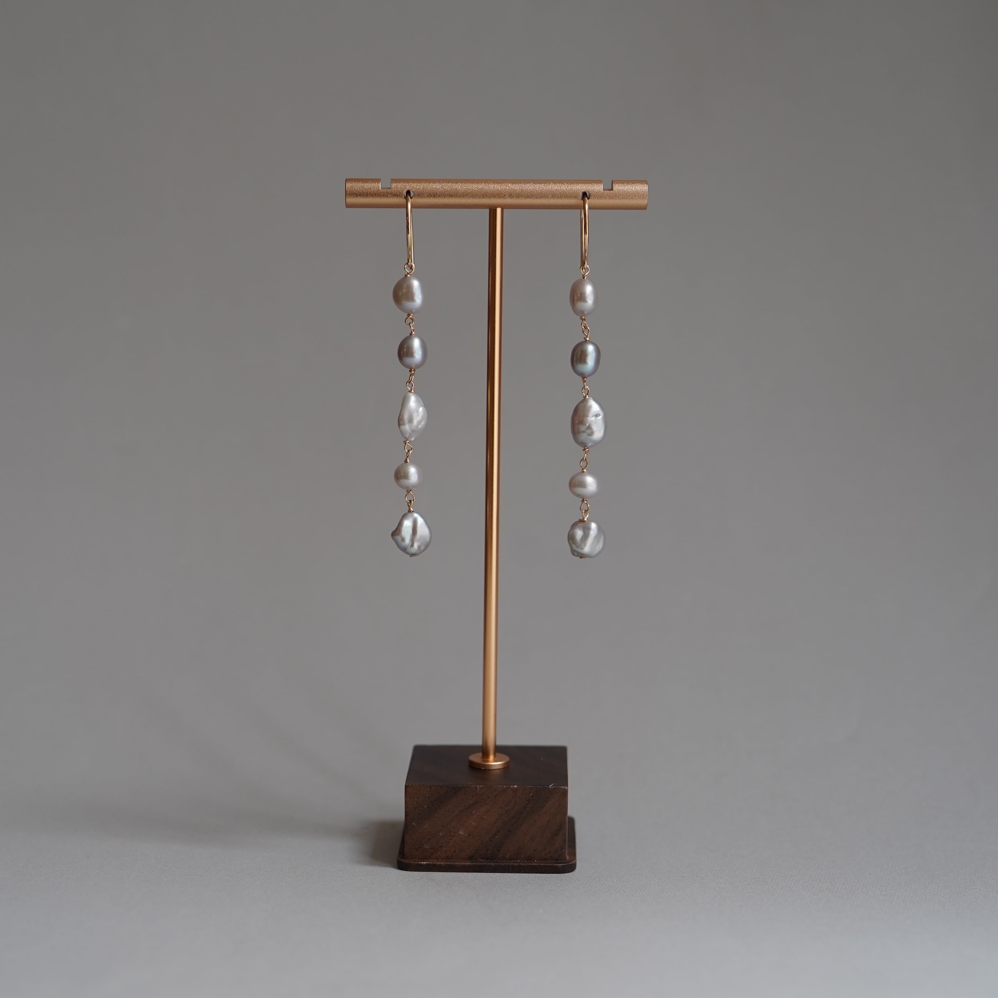様々な個性を持つ不揃いのバロック淡水パールを繋げたロングピアスです。
