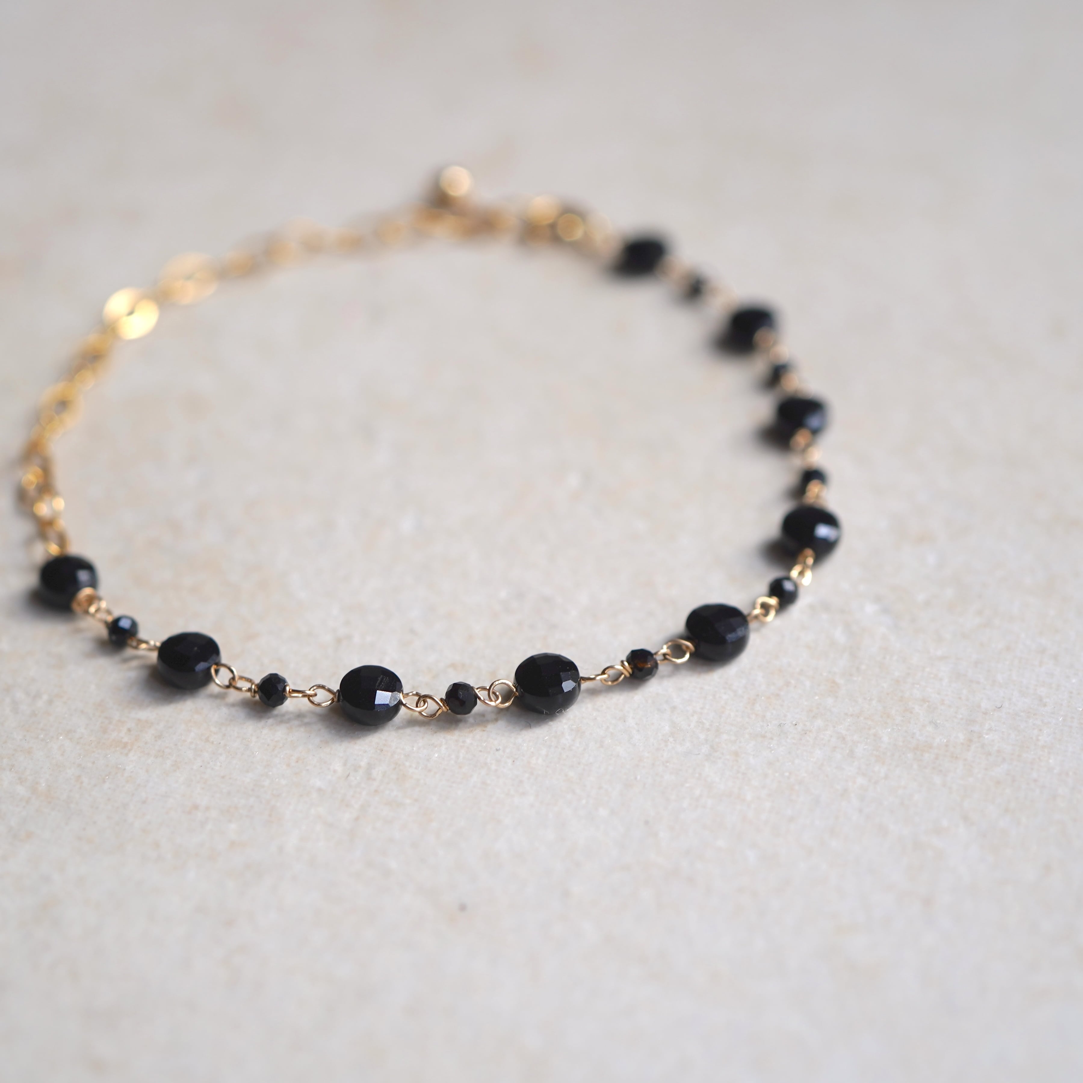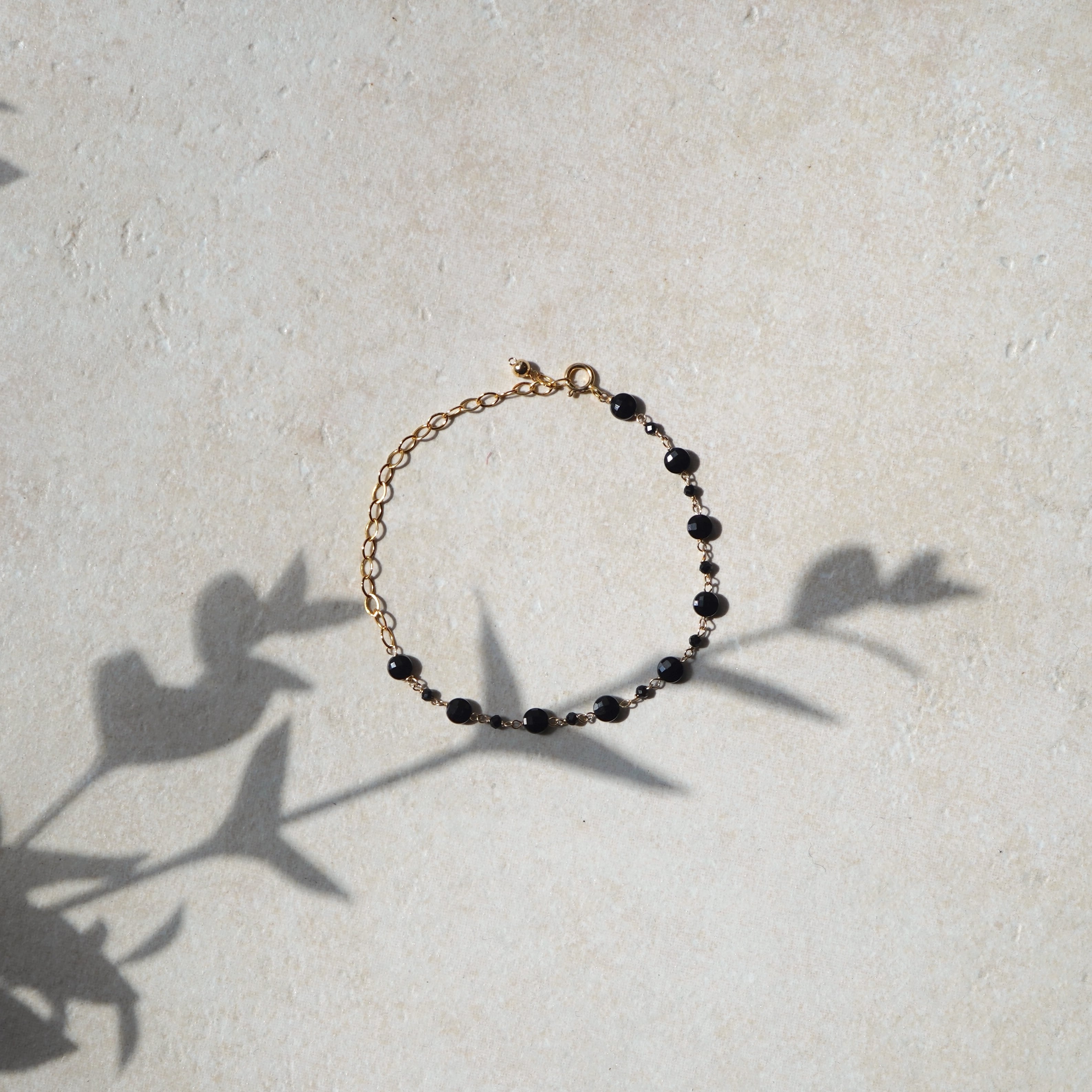 艶やかなコインカットと、極小ラウンドカットオニキスにゴールドチェーンを合わせたブレスレット。