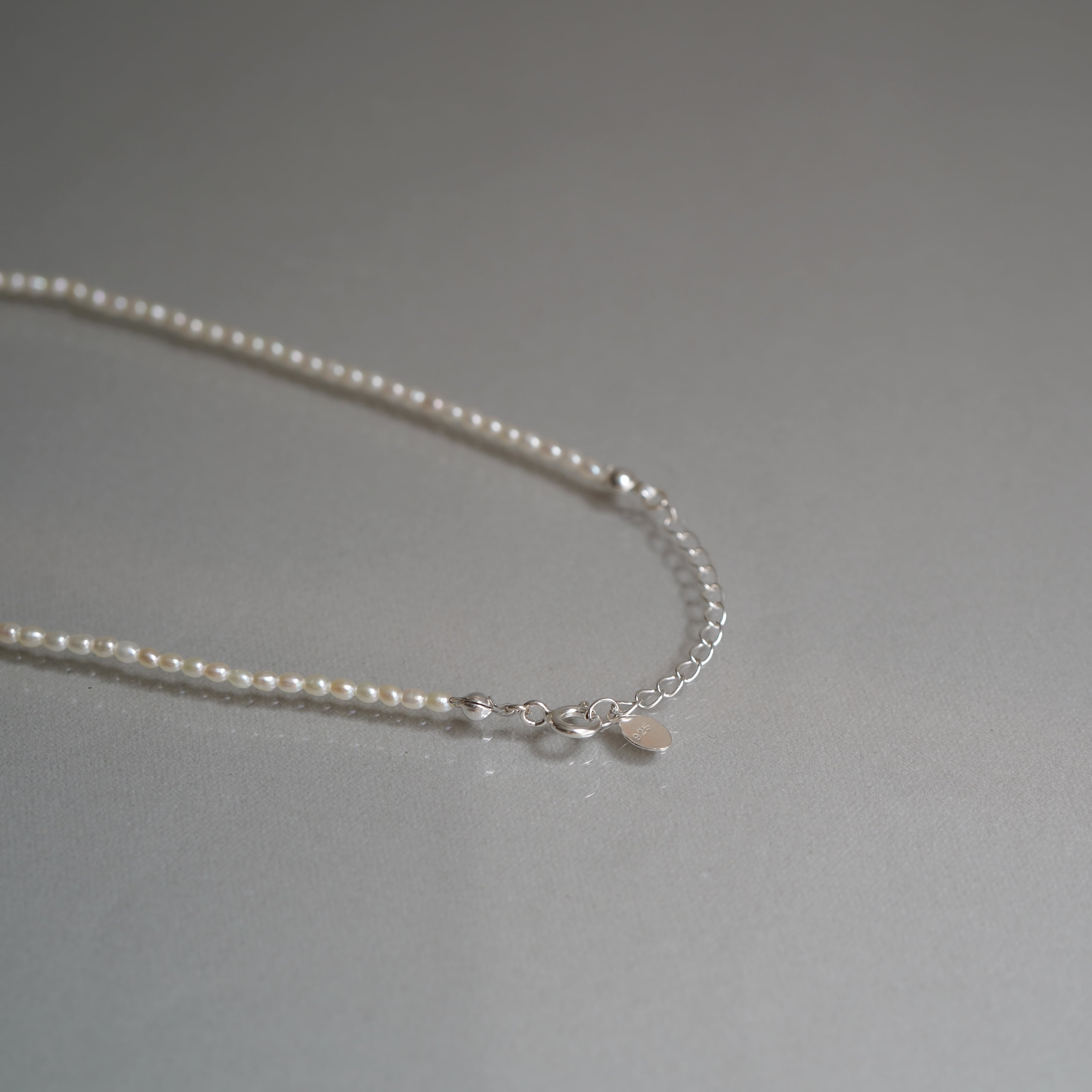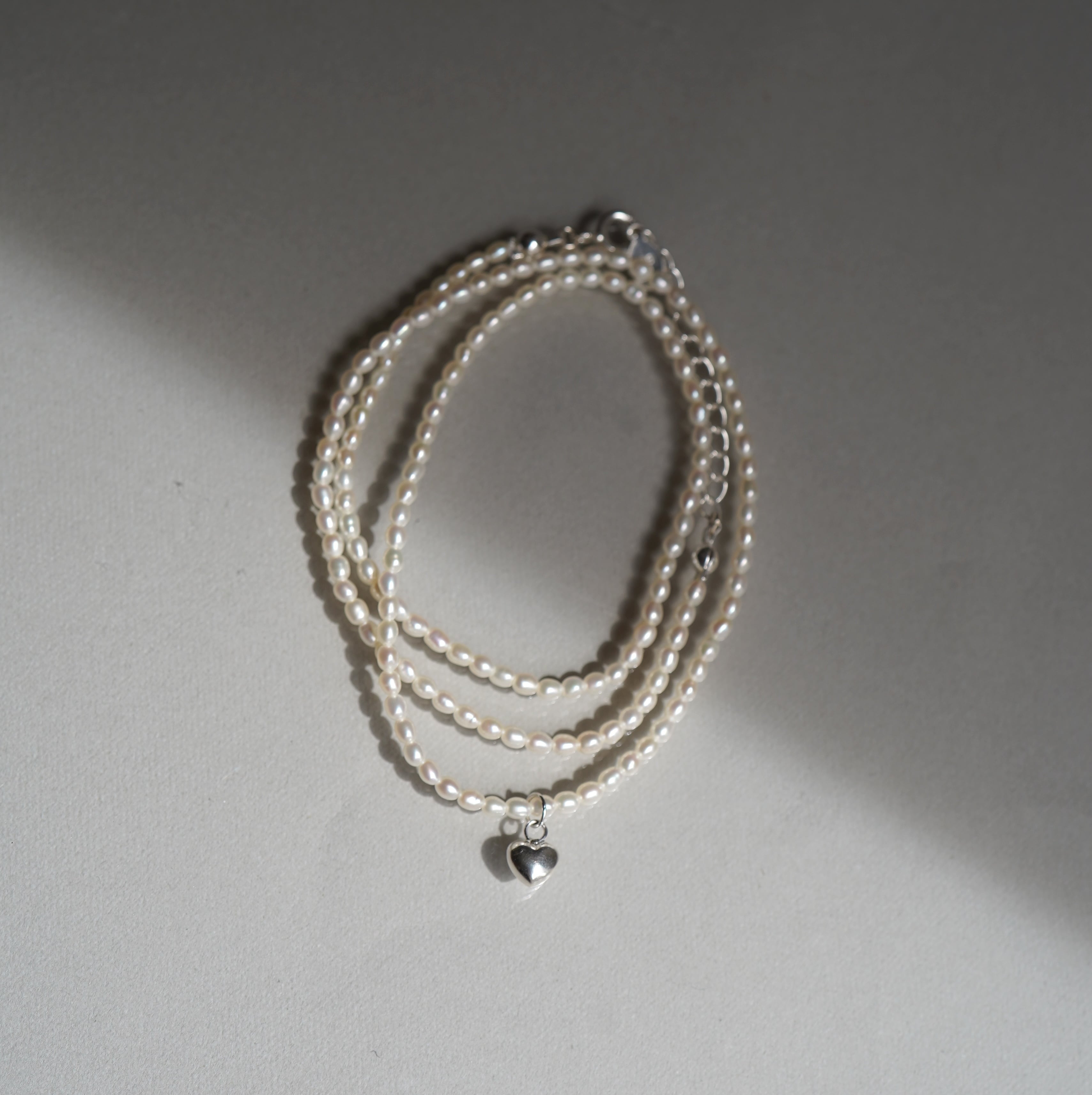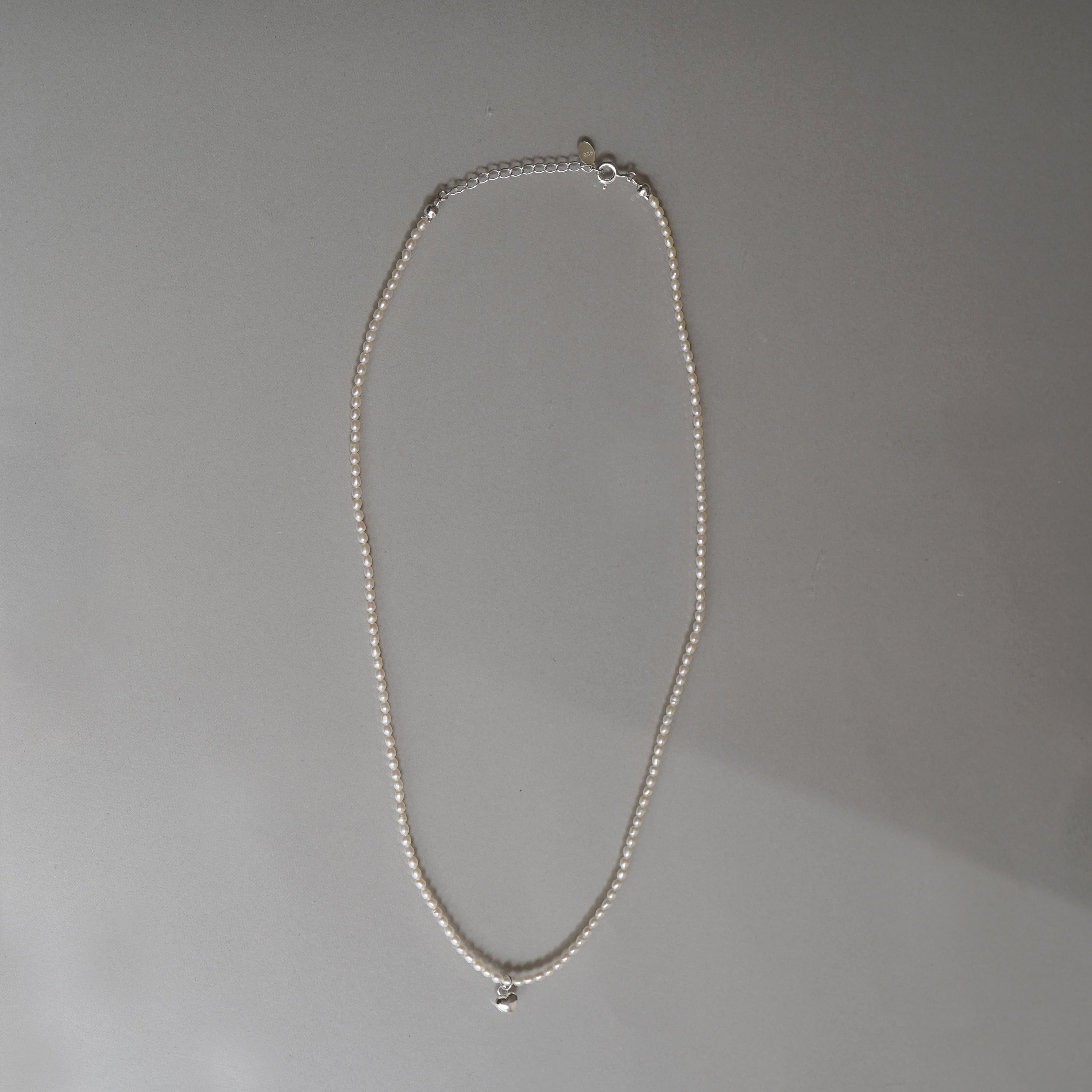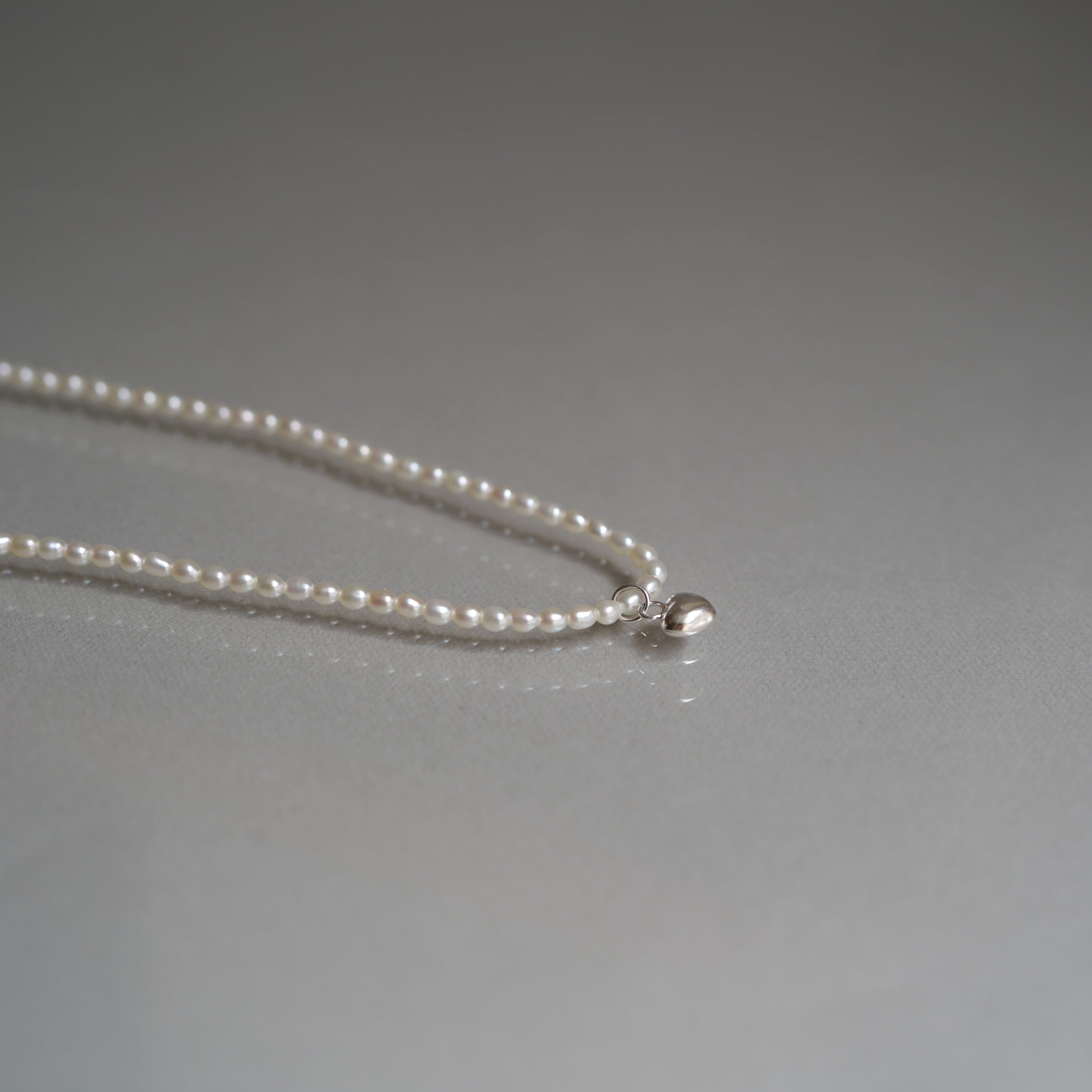 小粒ライスパールに小さなハートのチャームを添えた一連ネックレス。