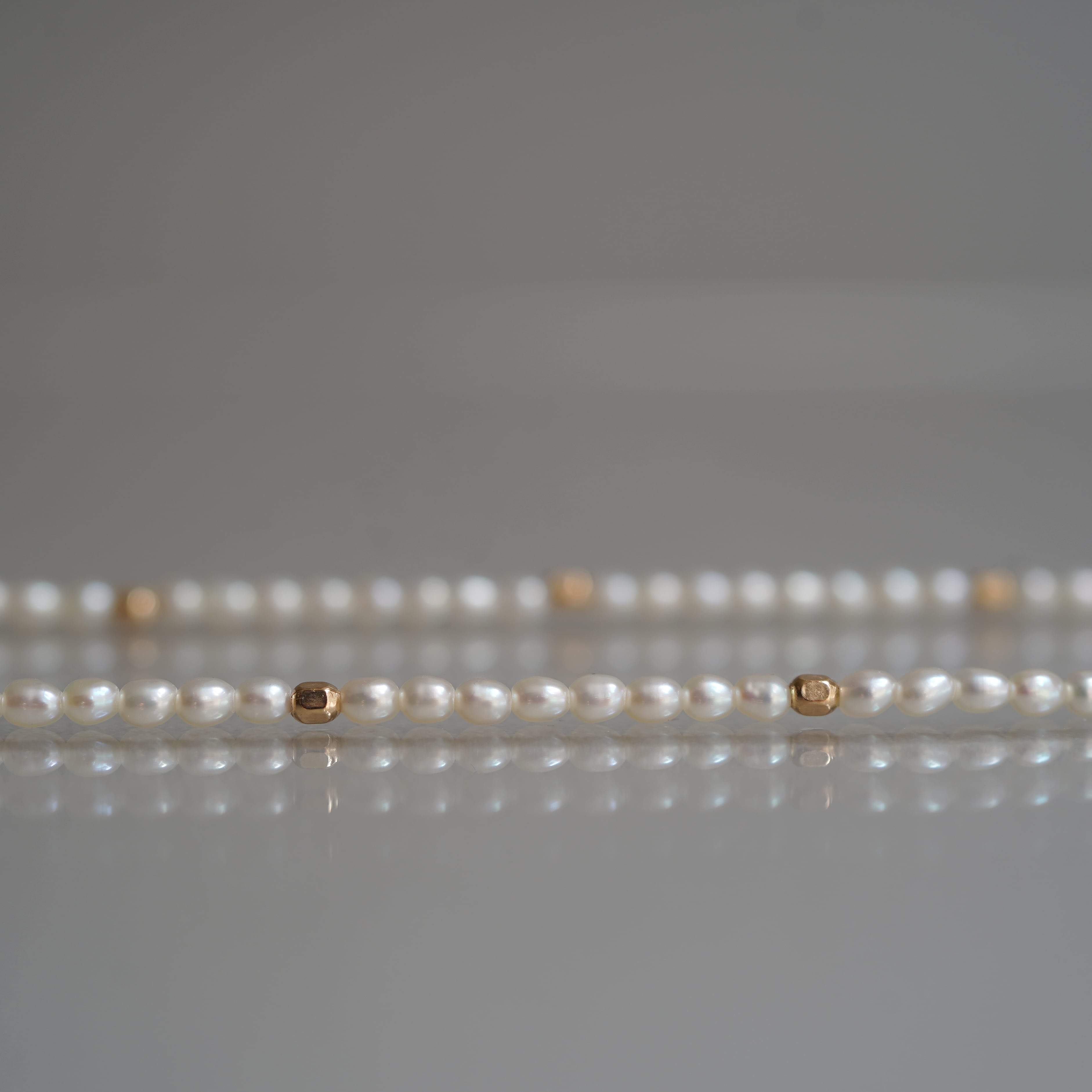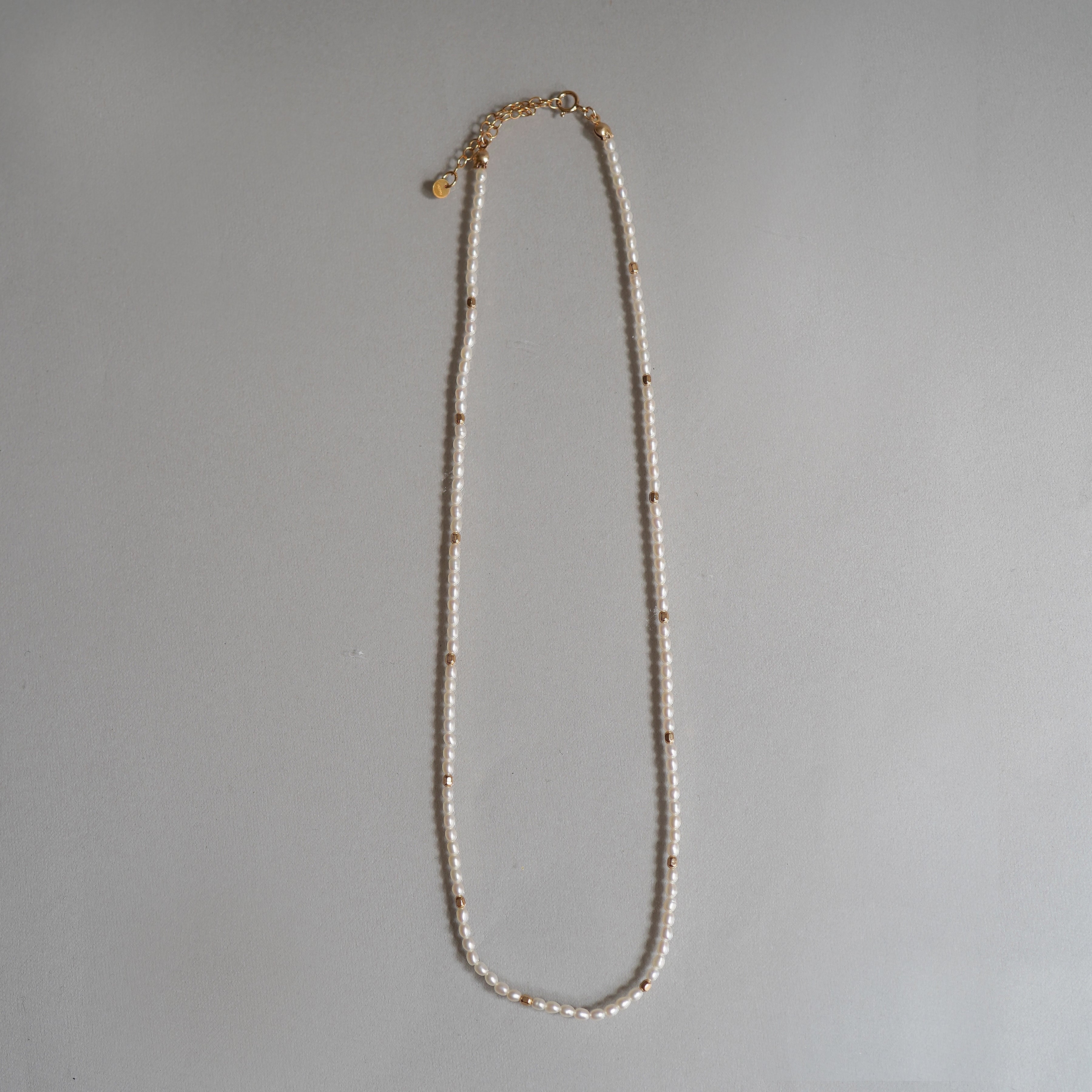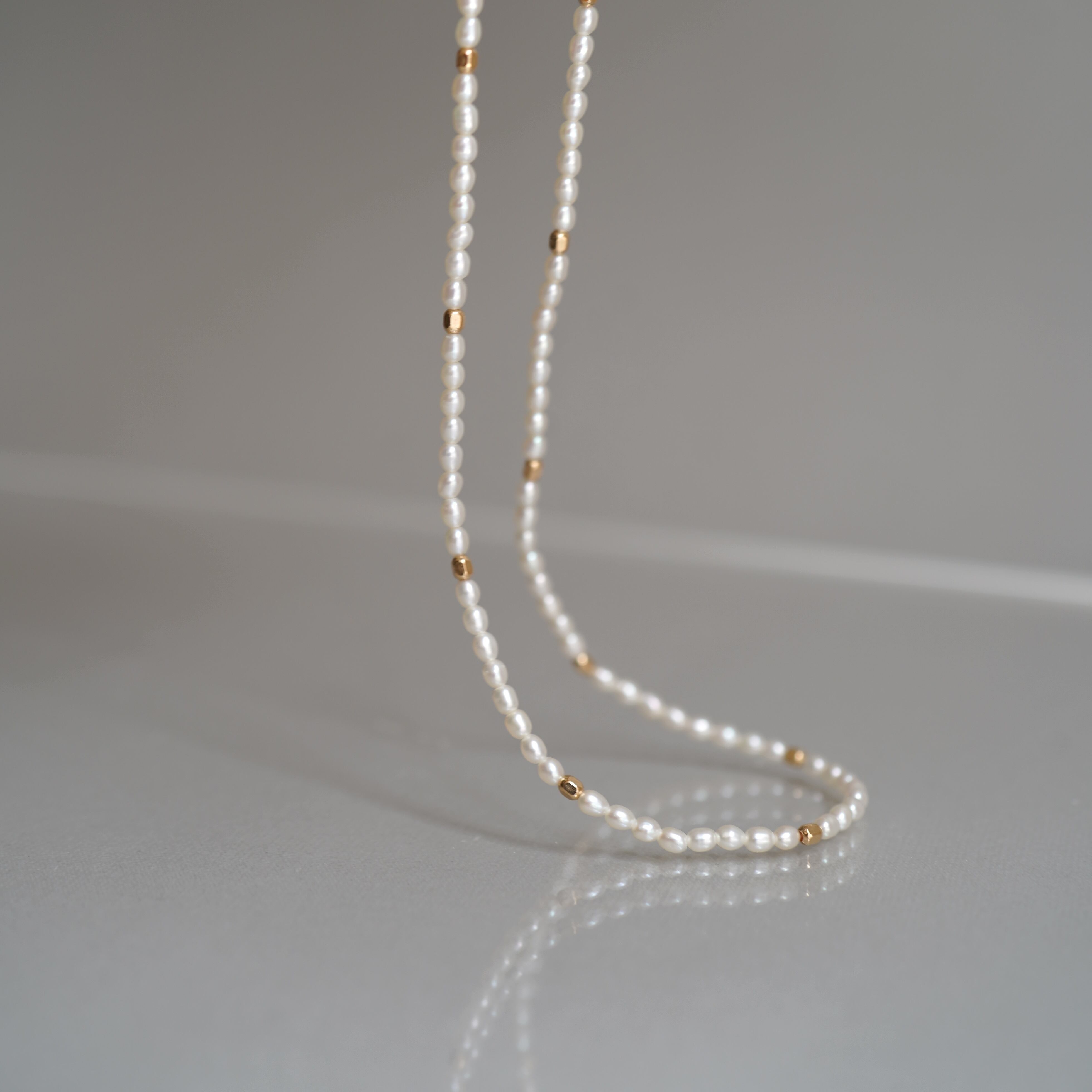 小粒ライスパールにゴールドビーズを合わせた一連ネックレス。