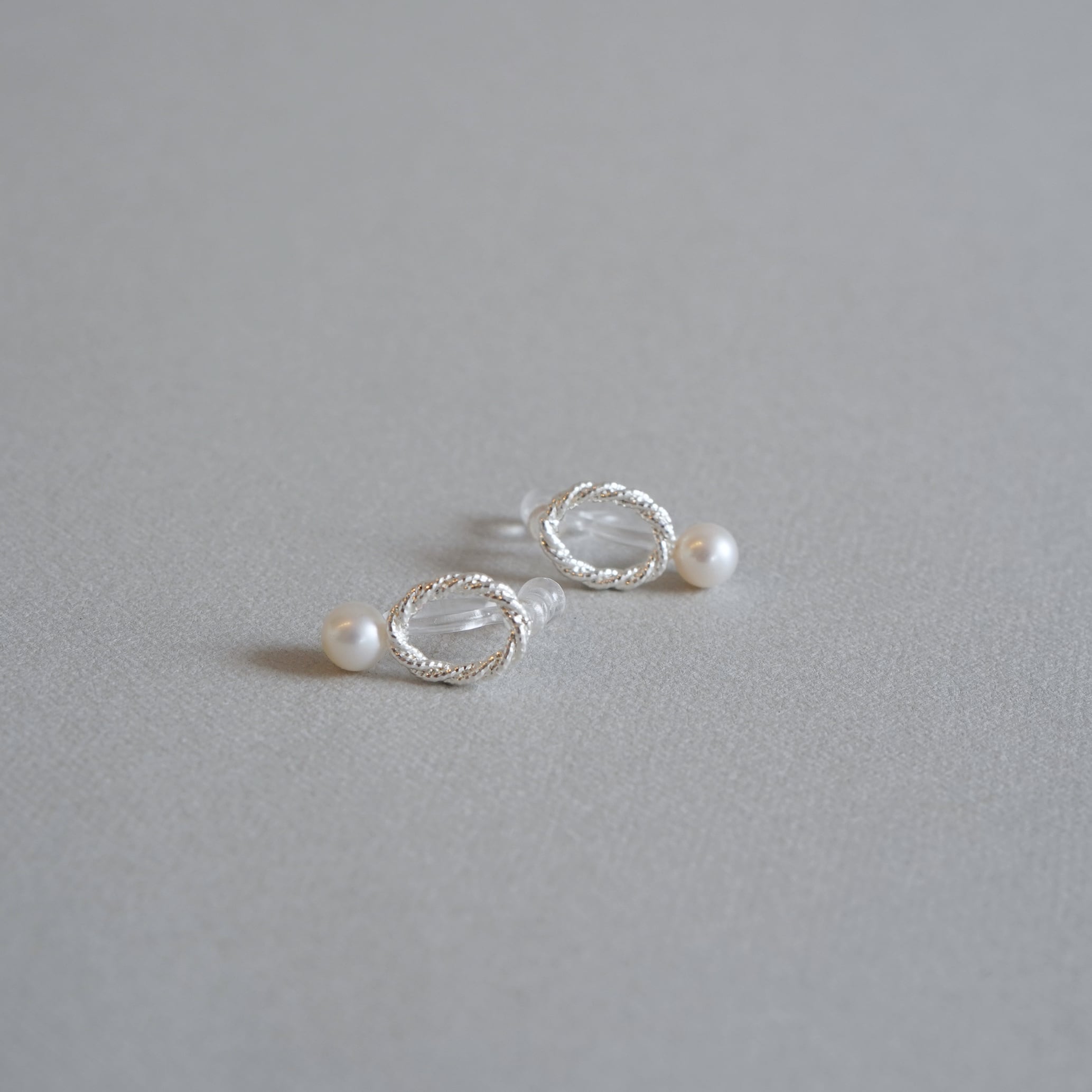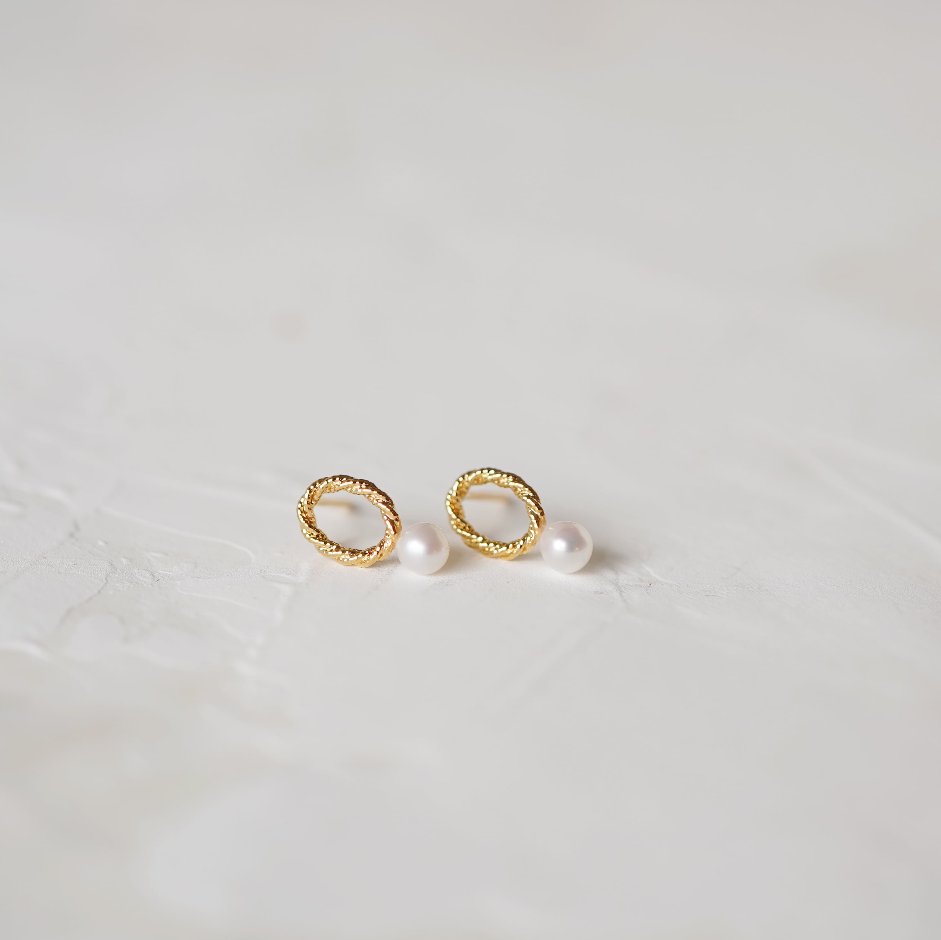 ツイストしたリングと淡水パールの組み合わせがクラシカル。